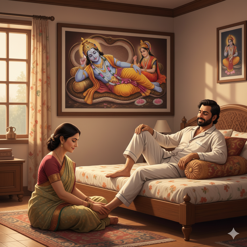 जैसे लक्ष्मीजी भगवान विष्णु के चरणों में सेवा करती हैं, वैसे ही पत्नी का यह प्रेमपूर्ण व्यवहार घर में शांति, सौभाग्य और स्थायी समृद्धि लाता है।